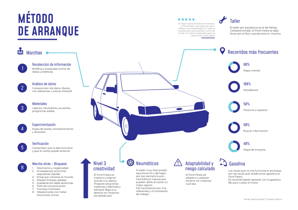 Esta infografía representa mi proceso de trabajo y esfuerzo personal a través del que he bautizado como «método de arranque», estableciendo un paralelismo entre mi trabajo y el sistema de encendido de un coche. Al igual que el motor de un coche necesita de una serie de pasos para poder arrancar, el desarrollo de cualquier proyecto requiere dedicación, constancia y un orden lógico para poder ser exitoso.